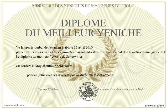 Envoyez par email votre Diplôme du meilleur Yeniche personalisé