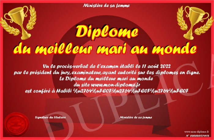 Envoyez par email votre Diplôme du meilleur mari au monde personalisé