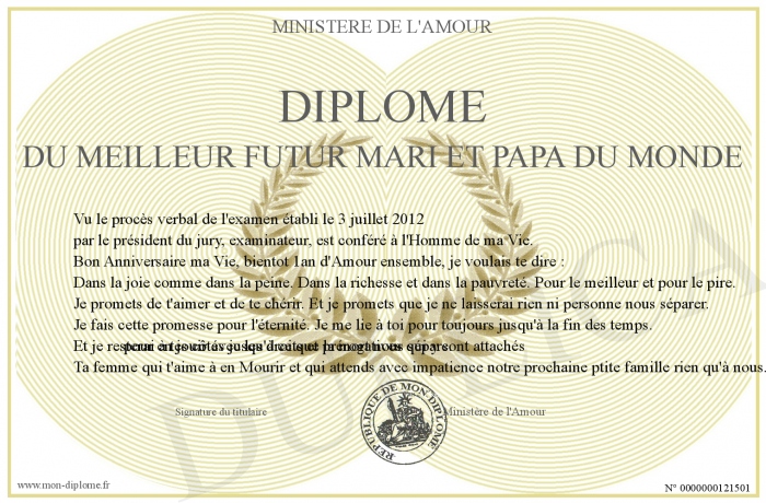 Envoyez par email votre Diplôme du Meilleur Futur Mari et Papa du Monde personalisé