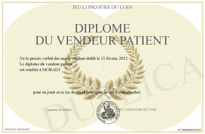 Envoyez par email votre Diplôme du VENDEUR PATIENT personalisé