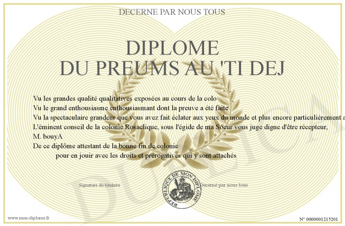 Envoyez par email votre Diplome du Preums au 'ti dej personalisé