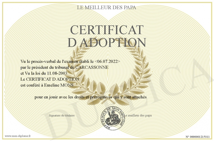 Envoyez par email votre CERTIFICAT D ADOPTION personalisé