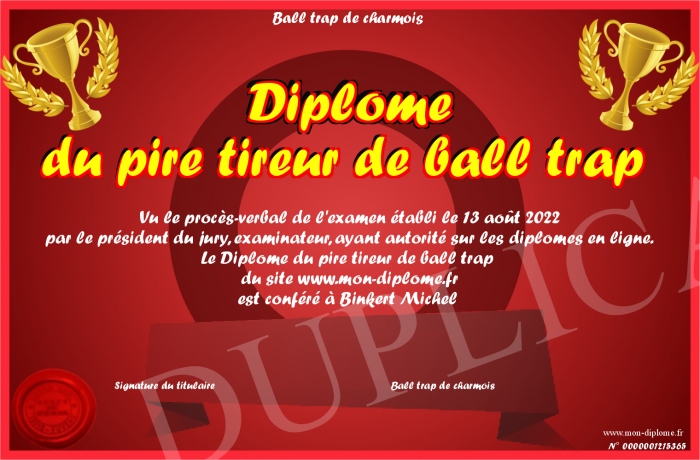 Envoyez par email votre Diplôme du pire tireur de ball trap personalisé