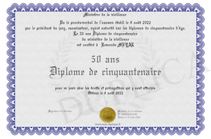 Envoyez par email votre 50 ans Diplôme de cinquantenaire personalisé