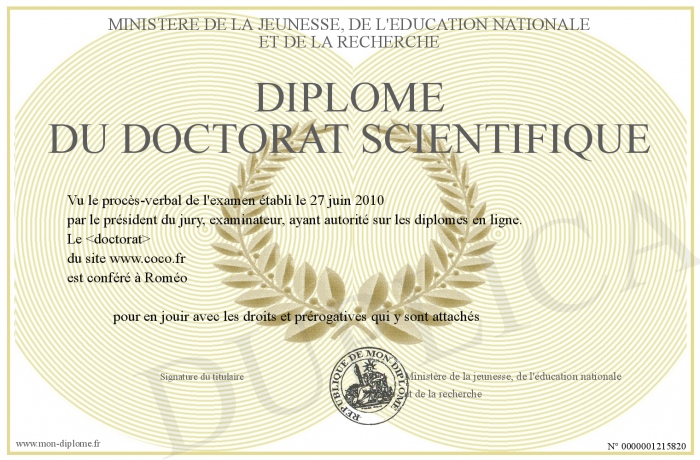 Envoyez par email votre Diplome Du Doctorat Scientifique personalisé