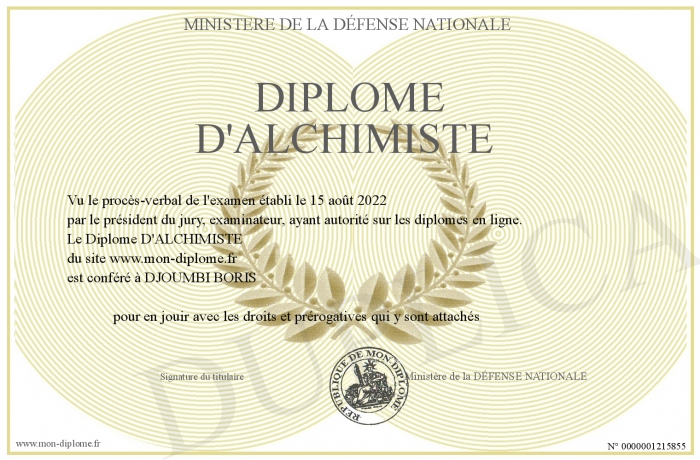 Envoyez par email votre Diplôme D'ALCHIMISTE personalisé