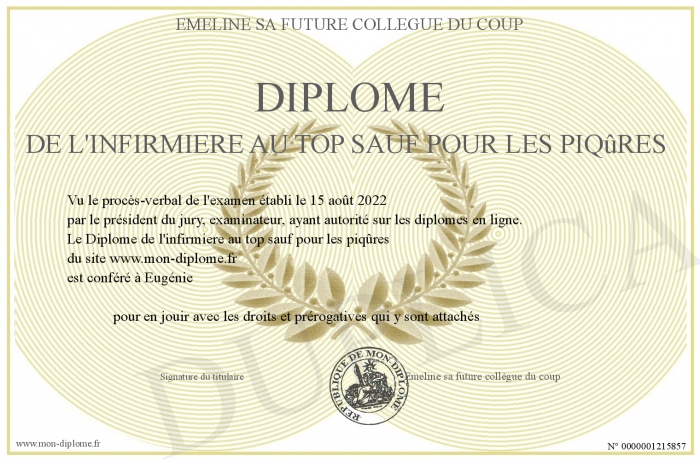 Envoyez par email votre Diplôme de l'infirmiere au top sauf pour les piqûres personalisé