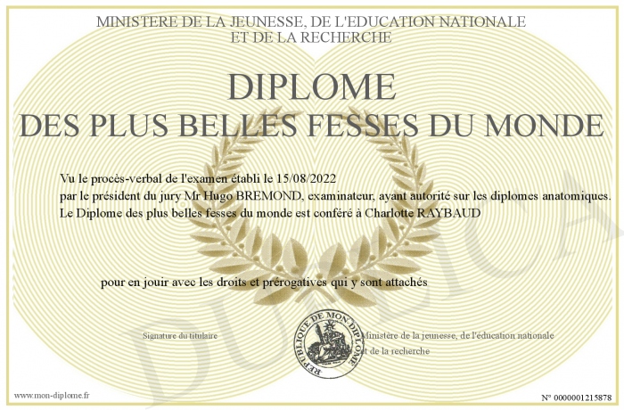 Envoyez par email votre Diplôme des plus belles fesses du monde personalisé