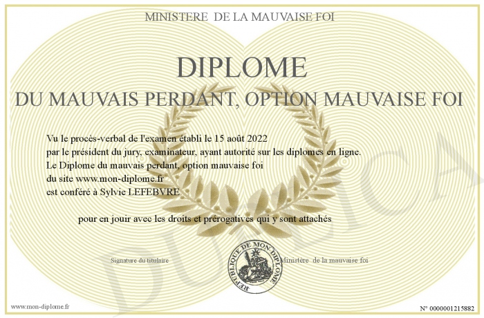 Envoyez par email votre Diplôme du mauvais perdant, option mauvaise foi personalisé