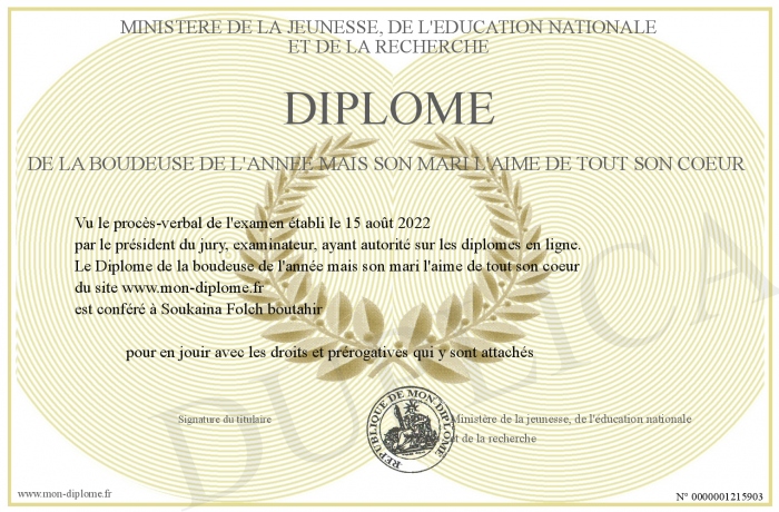 Envoyez par email votre Diplôme de la boudeuse de l'année mais son mari l'aime de tout son coeur personalisé