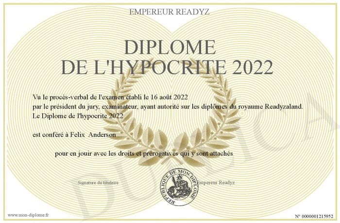 Envoyez par email votre Diplôme de l'hypocrite 2022 personalisé