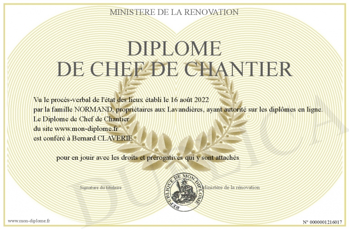 Envoyez par email votre Diplôme de Chef de Chantier personalisé