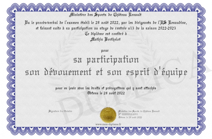 Envoyez par email votre sa participation son dévouement et son esprit d'équipe personalisé