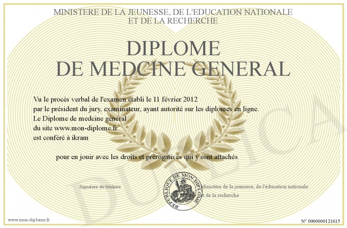 Envoyez par email votre Diplôme de medcine général personalisé