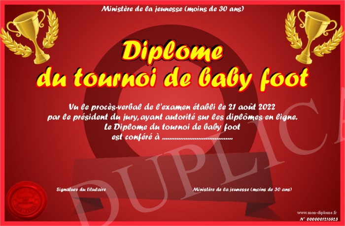 Envoyez par email votre Diplôme du tournoi de baby foot personalisé