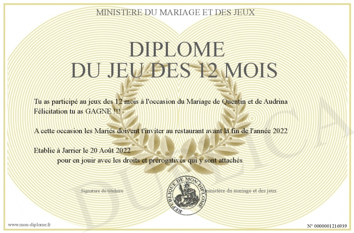 Envoyez par email votre Diplôme du jeu des 12 mois personalisé
