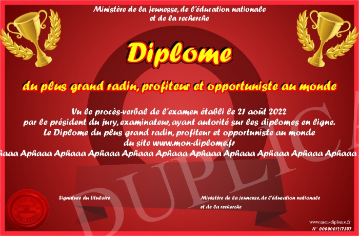 Envoyez par email votre Diplôme du plus grand radin, profiteur et opportuniste au monde personalisé