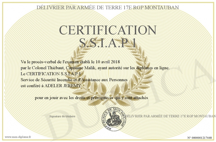 Envoyez par email votre CERTIFICATION S.S.I.A.P 1 personalisé