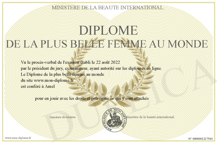 Envoyez par email votre Diplôme de la plus belle femme au monde personalisé