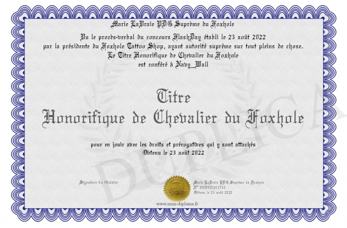 Envoyez par email votre Titre Honorifique de Chevalier du Foxhole personalisé