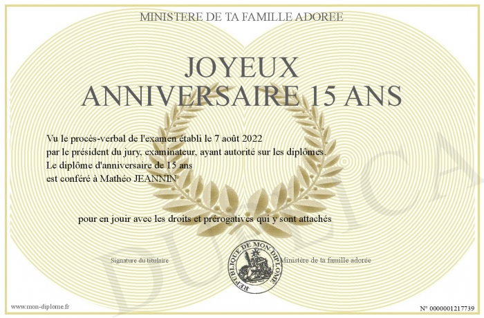 Envoyez par email votre JOYEUX ANNIVERSAIRE 15 ans personalisé