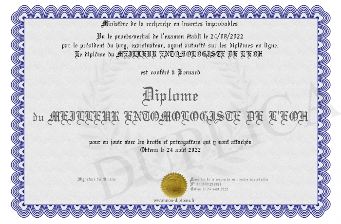 Envoyez par email votre Diplôme du MEILLEUR ENTOMOLOGISTE DE L'EOH personalisé