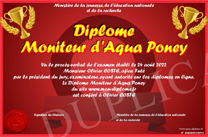 Envoyez par email votre Diplôme Moniteur d'Aqua Poney personalisé