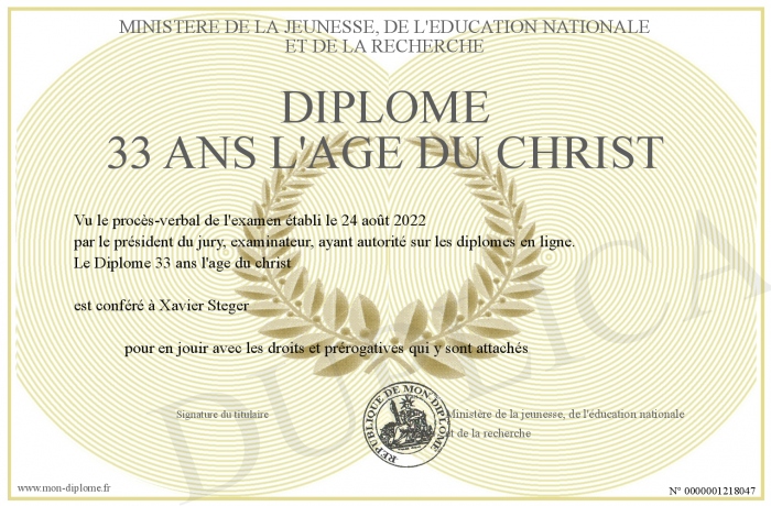 Envoyez par email votre Diplôme 33 ans l'age du christ personalisé