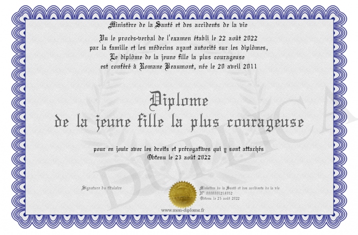 Envoyez par email votre Diplôme de la jeune fille la plus courageuse personalisé