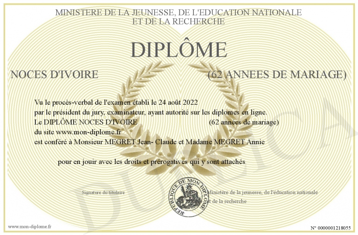 Envoyez par email votre DIPLÔME NOCES D'IVOIRE (62 années de mariage) personalisé