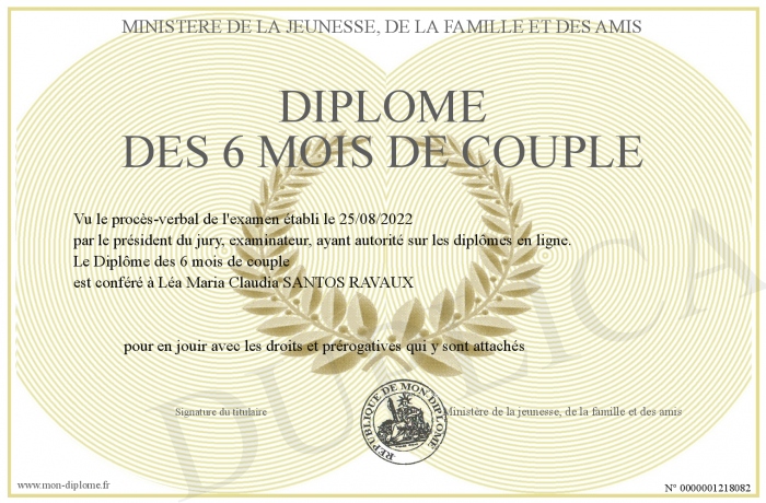Envoyez par email votre Diplôme des 6 mois de couple personalisé