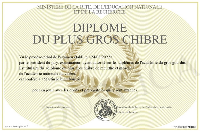 Envoyez par email votre Diplôme du plus gros chibre personalisé