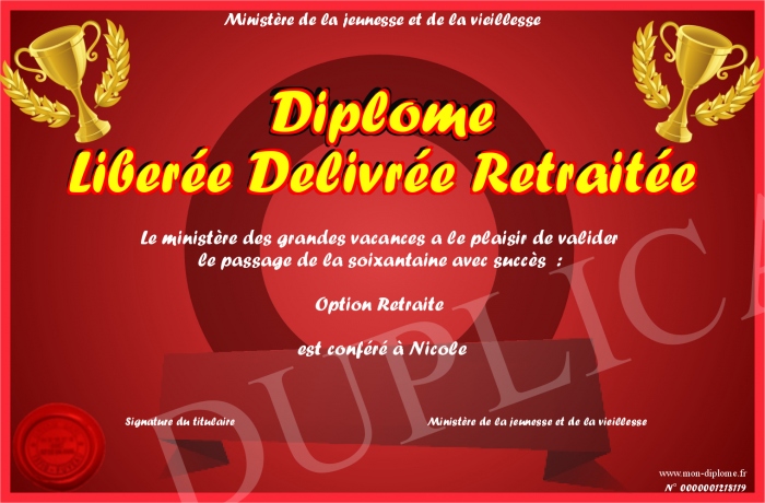 Envoyez par email votre Diplôme Liberée Delivrée Retraitée personalisé