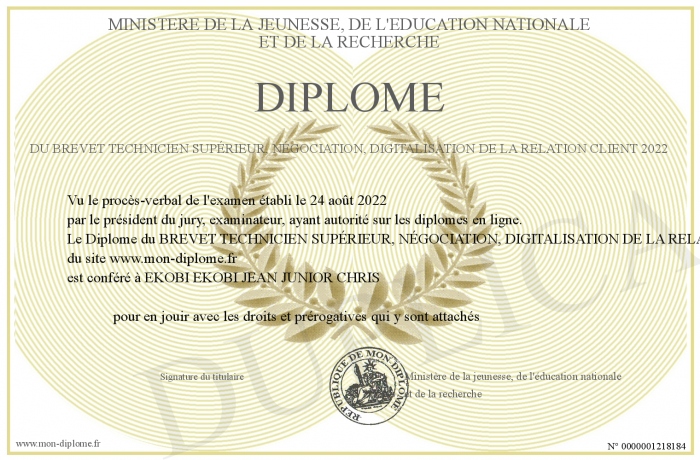 Envoyez par email votre Diplôme du BREVET TECHNICIEN SUPÉRIEUR, NÉGOCIATION, DIGITALISATION DE LA RELATION CLIENT 2022 personalisé