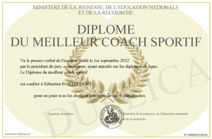 Envoyez par email votre Diplôme du meilleur coach sportif personalisé