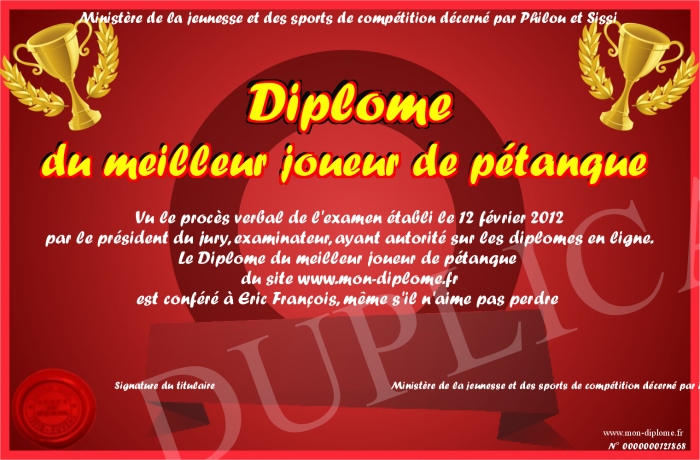 Envoyez par email votre Diplôme du meilleur joueur de pétanque personalisé