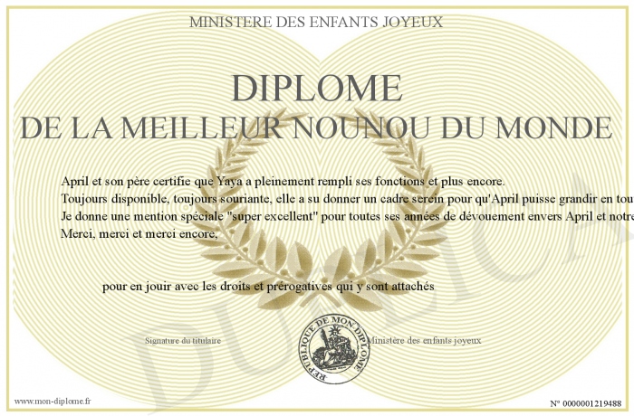 Envoyez par email votre Diplôme de la meilleur nounou du monde personalisé