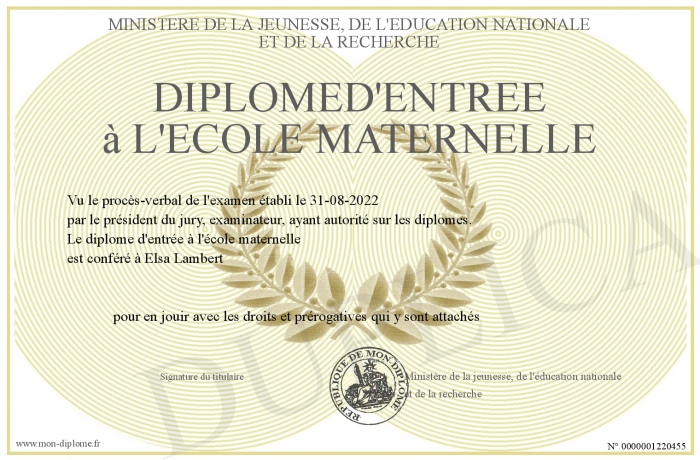 Envoyez par email votre Diplômed'entrée à l'école maternelle personalisé