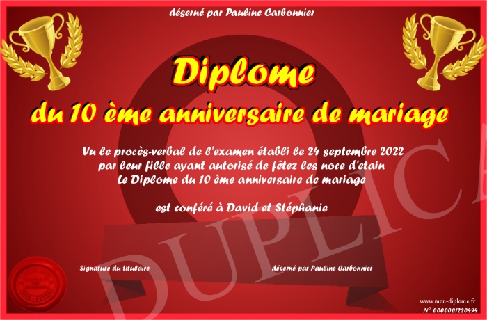 Envoyez par email votre Diplome du 10 ème anniversaire de mariage personalisé