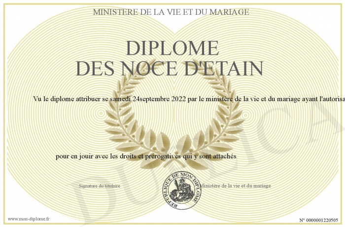 Envoyez par email votre Diplôme des NOCE d'etain personalisé