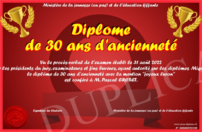 Envoyez par email votre Diplôme de 30 ans d'ancienneté personalisé