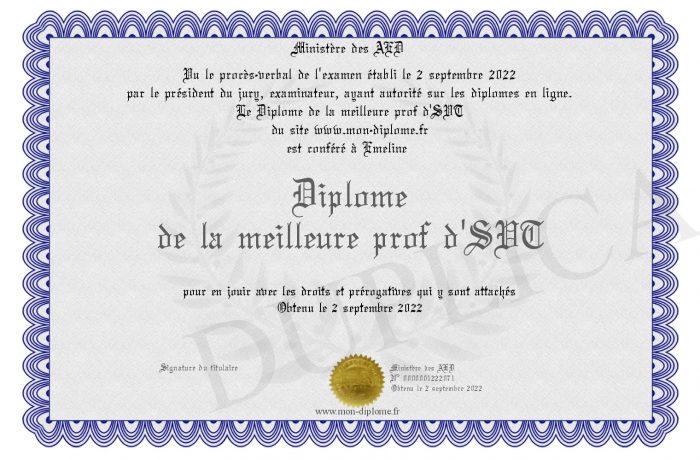 Envoyez par email votre Diplôme de la meilleure prof d'SVT personalisé