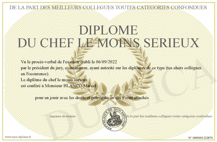 Envoyez par email votre Diplôme du chef le moins sérieux personalisé