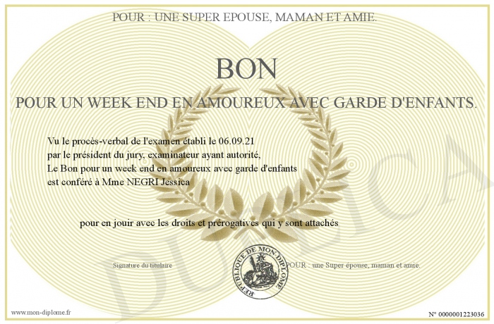 Envoyez par email votre Bon pour un week end en amoureux avec garde d'enfants. personalisé