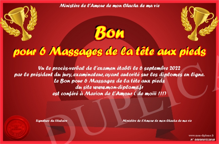 Envoyez par email votre Bon pour 6 Massages de la tête aux pieds personalisé