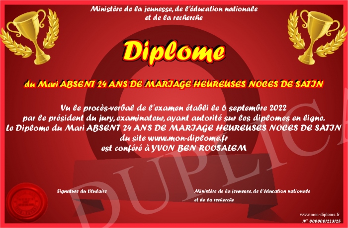 Envoyez par email votre Diplôme du Mari ABSENT 24 ANS DE MARIAGE HEUREUSES NOCES DE SATIN personalisé
