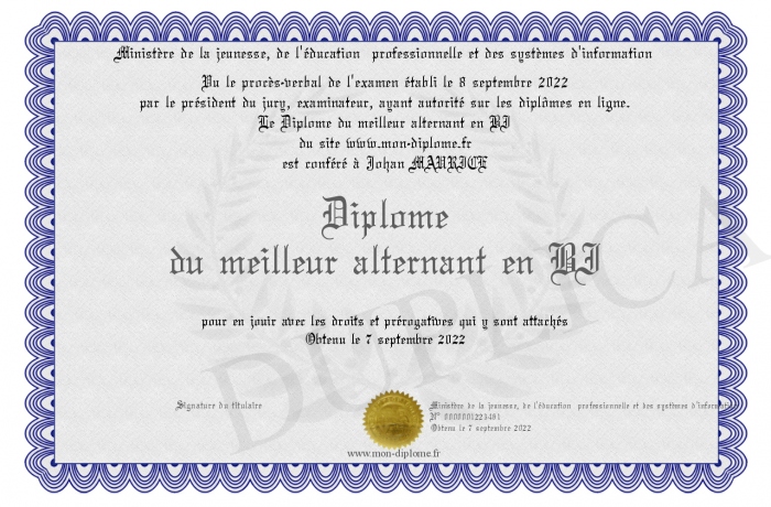 Envoyez par email votre Diplôme du meilleur alternant en BI personalisé