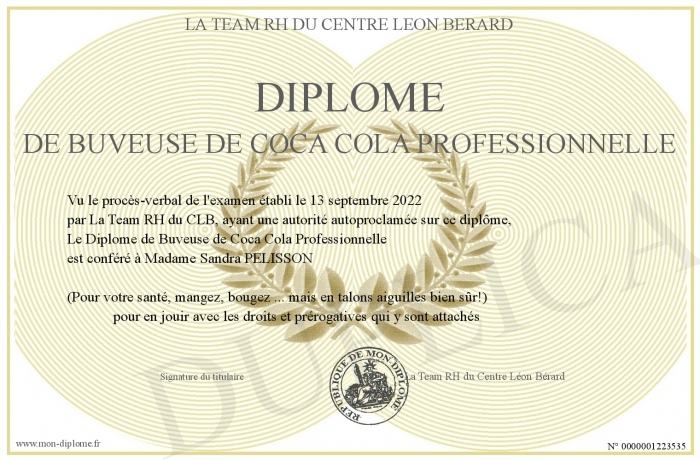 Envoyez par email votre Diplôme de Buveuse de Coca Cola Professionnelle personalisé