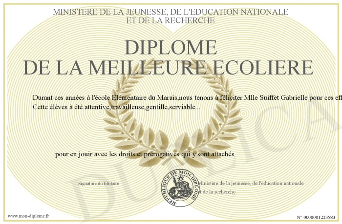 Envoyez par email votre Diplôme de la meilleure écolière personalisé