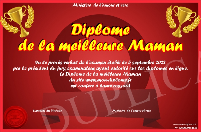 Envoyez par email votre Diplome de la meilleure Maman personalisé